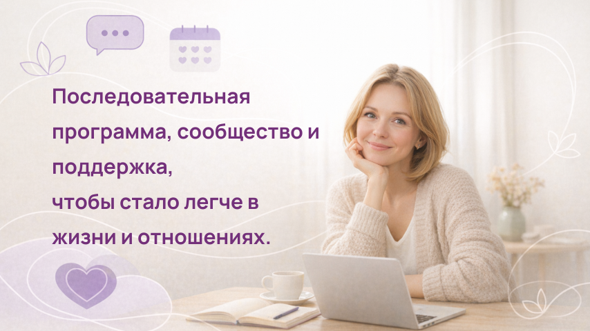 Здесь вы найдете продуманную программу с практиками и упражнениями, которые безопасно помогают разобраться в себе. Вы можете начать учиться прямо